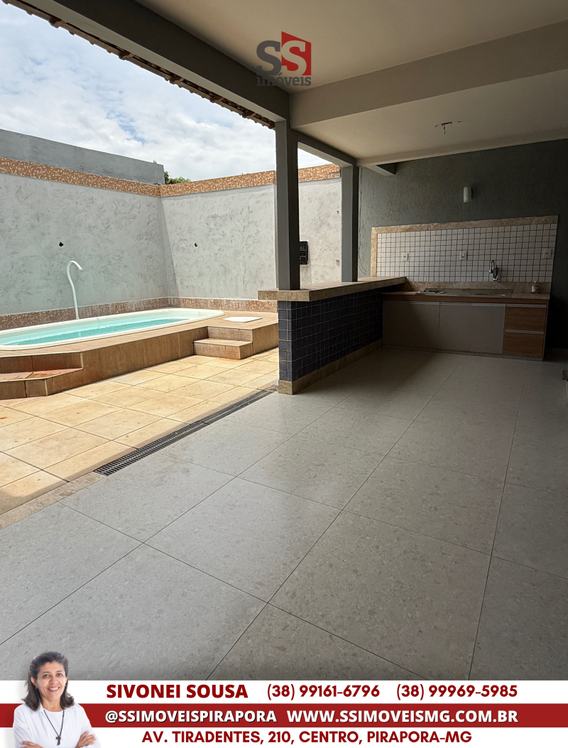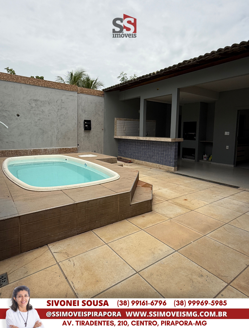 COMPRE: Casa com 3 quartos (1 suíte com closet), sala para 2 ambientes, copa, cozinha, banheiro social, área gourmet com churrasqueira e piscina, banheiro externo, área de serviço, garagem e quintal.